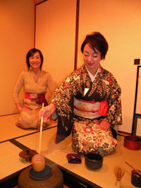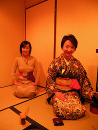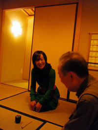 (左)高田さんのために優しくお茶を点てる私 (右)林さんには「さあどうぞ」と無理やりお菓子を勧める? |