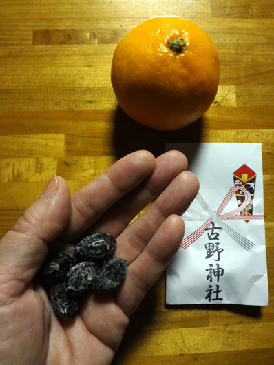 これは、元旦(深夜)に母たちと連れ立って初詣に出かけた先の小さな神社でいただいた「お年玉」の蜜柑と甘納豆です。