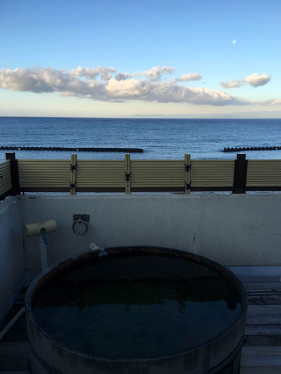 今井さん宅の近くの旅館で宿泊。海を見ながらの入浴。絶景かな…