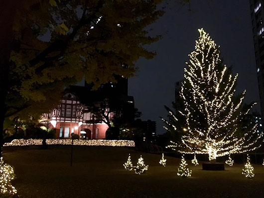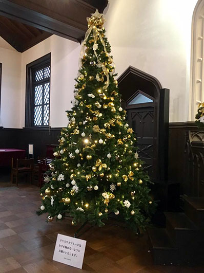 明治学院大学(白金キャンパス)の屋外に立つクリスマスツリー。