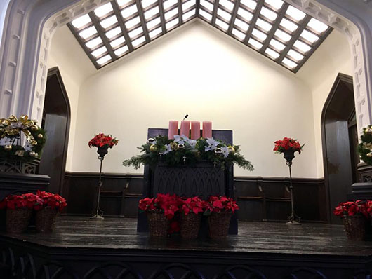 壇上に見える4本のピンクの蠟燭が「アドベント・キャンドル」です。