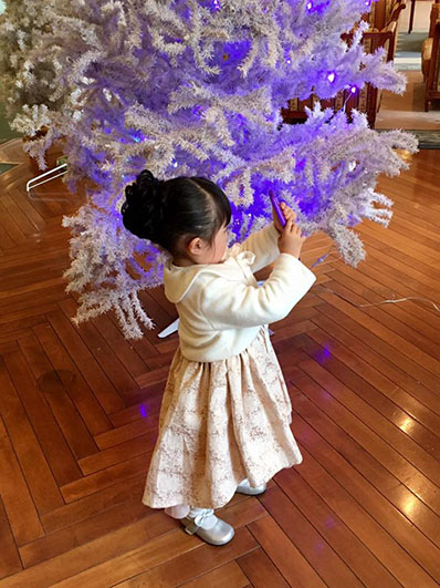 写真は会場に飾ってあったツリーを撮影する孫娘(2歳9か月)。 |