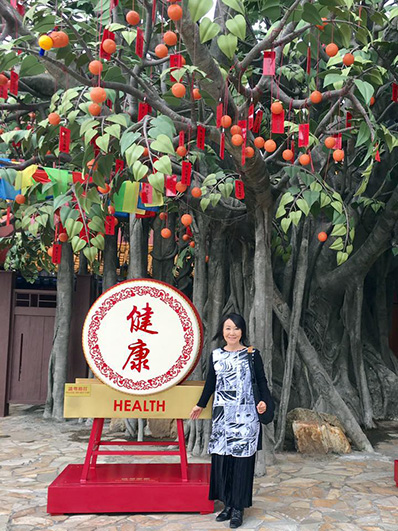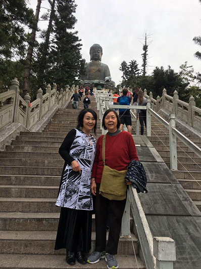 ランタオ島にある宝蓮寺の天壇大仏の前で、メイと。