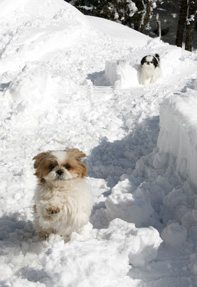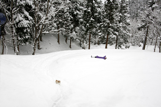 山小屋の前庭にて。ブースケと一緒に雪と戯れるの図 |