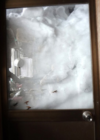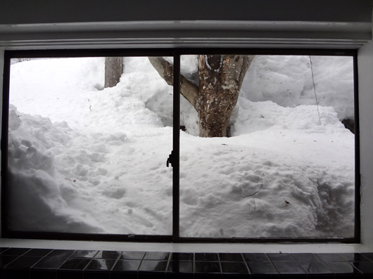 奥信濃の山小屋はまだまだ雪の底! (左)キッチンの扉越しに見た外界。