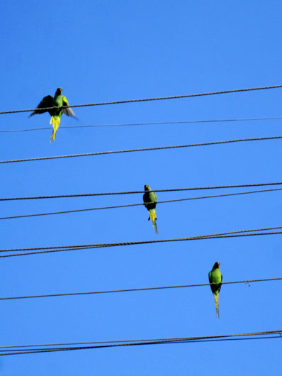 窓の外の電線にはカラフルなインコが集まってきて心が和む |