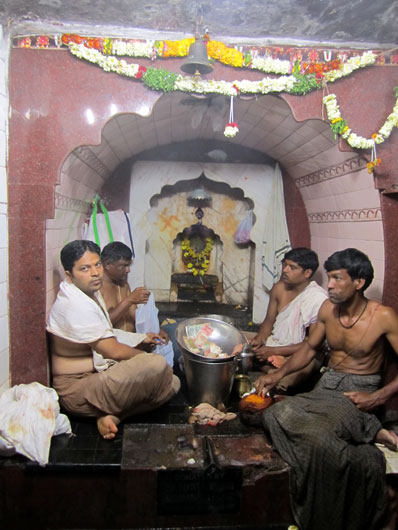長く暗い洞窟を歩ききると、最後に4人の僧侶に守られた小さなナラシンハ寺院にたどり着いた。僧侶の一人から眉間にクムクム(ヒンドゥー教の赤い印)を塗ってもらうと、ちょうど四国のお遍路でご朱印をいただいた時と同じような心持ちがした。