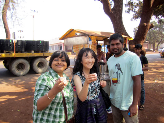 ドライブ途中、路傍のお茶屋さんで小休憩(左がシャロカ、右がヴェンカテーシュ。撮影 by ヒロ)