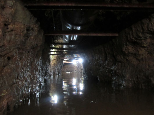 このような水路が延々と続く。天井には排水管と思しき巨大なパイプが這っていた