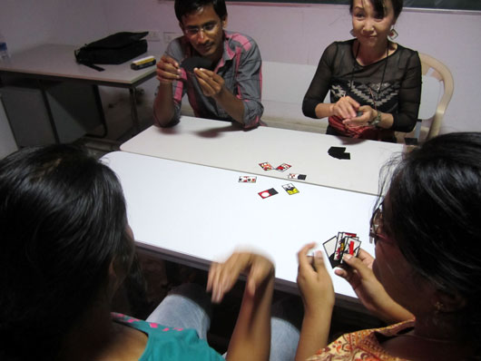 今日は通常の授業日。日本に渡ったインドの神々から観た日本史と日本語を引き続き教えたあと、残り時間で日本の伝統ゲームである「花札」の遊び方を教えた。