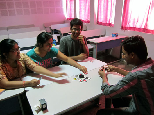 任天堂は、ここインドでも超有名ゲームメーカーだが、この会社が創業後に初めて売り出した商品が花札であることを告げると、学生達の口からは“Really?!”という驚きの声があがった。