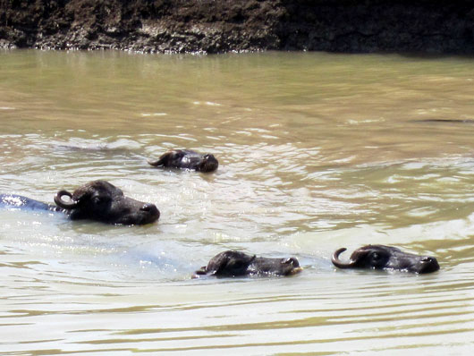 アマラヴァティのクリシュナ川にて、水から顔だけ出して悠々と川を渡るバッファローたち