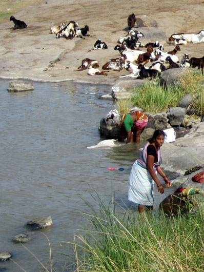 クリシュナ川で洗濯する女性達の近くでは、山羊の群れが休憩中