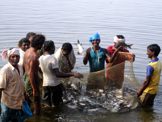 近くの池では男たちが魚捕りの真っ最中。ただし稚魚はリリースしていた。
