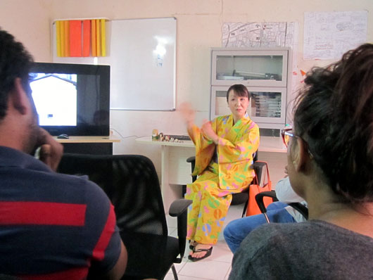 デザイン学部の教授と大学院生を前に、問題の浴衣をまとって特別講義中