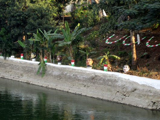 事故現場の脇を流れる川(おそらくクリシュナ川)をふと見ると、「生首」風のオブジェが4つ。