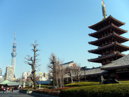 (右)浅草寺から見たスカイツリー(左端に見えるタワー)。どちらも2011年3月29日撮影 |