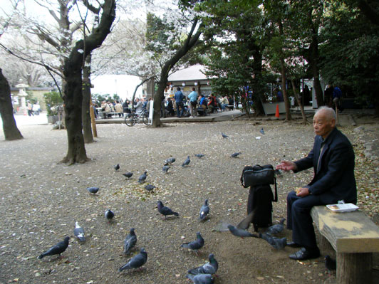多くの仲間が眠る靖国神社の桜の下で、たいやきのカケラを鳩に与える村上氏。