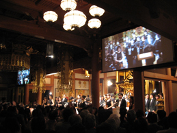 行なわれているご本堂の様子。遠くの人にも演奏者の表情がよく見えるよう、大スクリーン