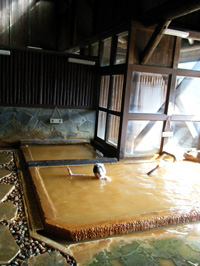 (右)そんなパンダを尻目に、私は鉄分の多い“赤い温泉”でぬくぬく(笑)