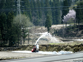 満開の桜の横で除雪作業するオジサンの姿がシュールです。パンダも残雪に興味津津!