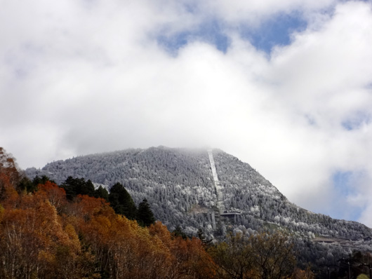 手前の森は「まだ秋」、奥の山は「もう冬」。秋と冬の境目がビジュアルでハッキリ見えた横手山