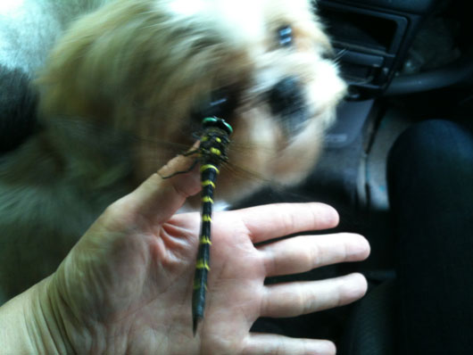 新幹線の駅まで送り、家へ戻る道中、オニヤンマが車中に飛び込んできました。