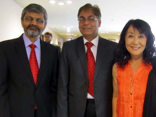 左より: インド工科大学ハイデラバード校のデサイ学長、駐日インド大使館のクマール公使、私 |