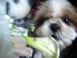ママリンが誕生日にいただいた花の香りを楽しんで