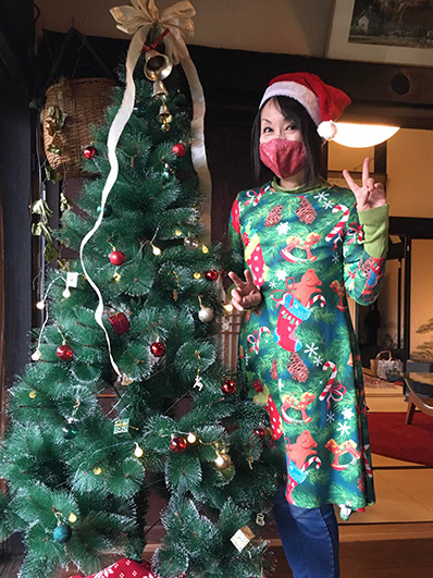 全身クリスマスコーデ。と言うか、ツリーみたいでしょ。