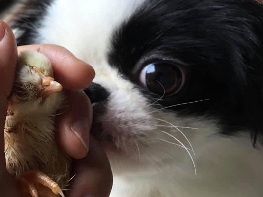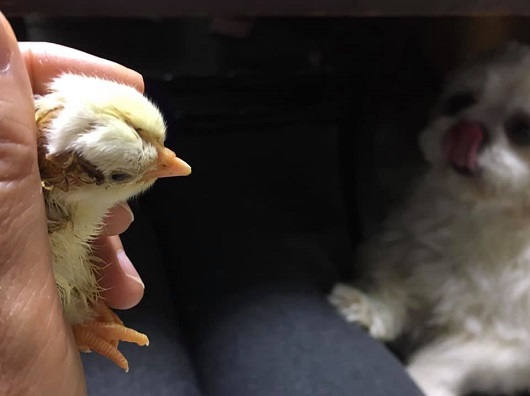 生まれたばかりのヒヨコに舌なめずりするクースケ。