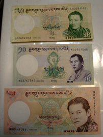 (右)ブータンの紙幣の一例。上から順に第3代国王、第4代国王、第5代(現)国王の肖像画入り