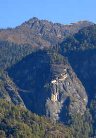 (左)ブータン第2の高峰チョモラリ山(7,314m) (右)断崖に建てられたタクツァン僧院