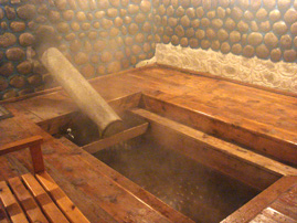 水の中に入れてお湯を温めるユニークなやり方。石のミネラルが溶け出し、健康に良いのだそうです。