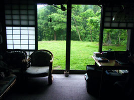 信州の山小屋。書斎から眺めた庭と、2階ベランダから見下ろした藤棚。緑が目にやさしい…… |