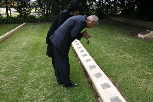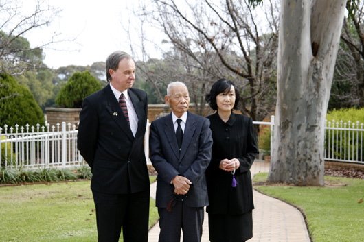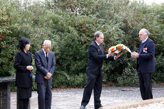 最初に、1944年8月5日の暴動で命を落とした4名のオーストラリア兵の墓に村上さんの手で花輪を手向け、全員で黙祷。