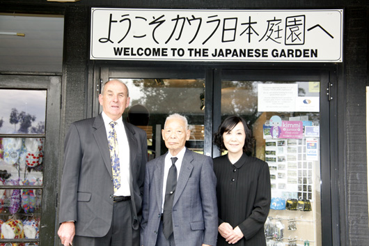 カウラ日本庭園入口にて(左から)カウラ市長のビル・ウェストさん、元捕虜の村上輝夫さん(91歳)、私 |