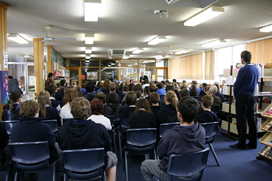 村上さんの話を聞くために会場の図書館に集まってくれた生徒と先生達。右端は取材にやって来た