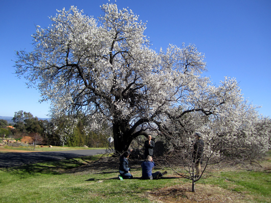 樹齢数百年と思われる梅の大木の前で写真撮影。収容所跡地のすぐ近くにあるこの木は、