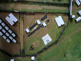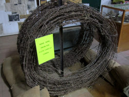 捕虜収容所で実際に使用されていた鉄条網。左下はカウラ戦争捕虜収容所の模型)