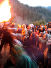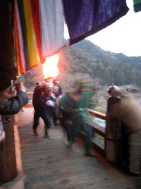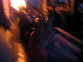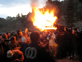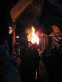 鬼を間近に見ようと身を乗り出す信者さんや観光客の頭上には火の粉がパラパラと降りかかり、ナイロン製のジャンパーに小さなこげ跡を作っている人もちらほら。なかなか危険な火祭りなのです。