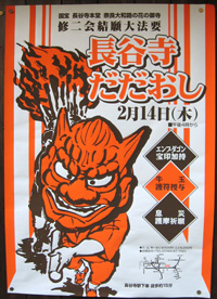 「だだおし」は、真言宗豊山派(ぶざんは)の総本山・長谷寺で7日間にわたって行なわれる修二会(しゅにえ)法要の最終日、すなわち結願(けちがん)の日に行なわれる悪魔退治の祭事で、毎年2月14日に行なわれています。