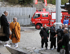 本堂の中では護摩炊き法要が始まり(左)、外では万が一の事態に備えて消防車がスタンバイしています(右) |