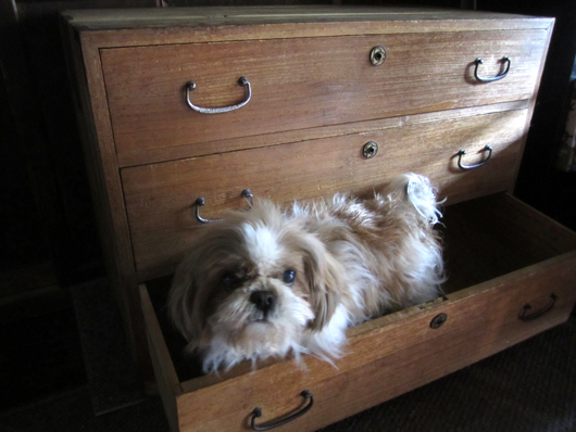 骨董品屋で見つけた桐の箪笥。手前味噌ですが私の部屋によく似合います(ブースケにも) |