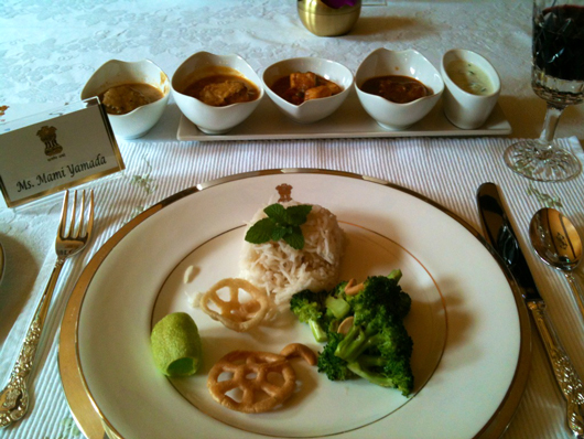 当日のランチ。前菜に「輪」をデザインした揚げ物が登場したのがいかにもインド的ですね。