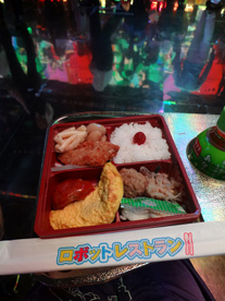 お客さんは基本的に座ったままショーを観覧しながら、お弁当をいただいたり、お茶やお酒を飲んだり、写真を撮ったり(撮影は動画を含めて自由)、色とりどりのサイリューム(いわゆるケミカルライト)を振らされたり(全員)、ロボットに搭乗したり(女性の希望者先着数名のみ)と、まあ~とにかく忙しい、忙しい。 |