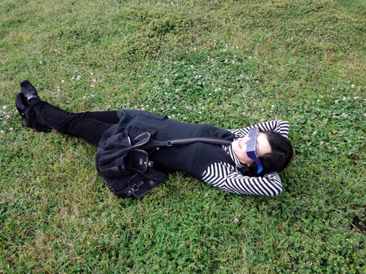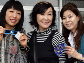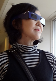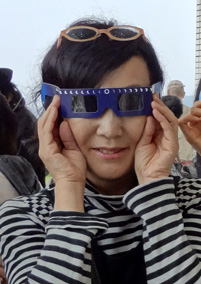 本当は私、フレームが白いプラスティック製のかなりイケテる日食グラスを3つも持っているんですよ。ところが、なぜか全〜部どこかに仕舞い込んでしまったらしく見つからなかったので、今回は友達から恵んでいただいたペラの紙製メガネ(お値段は580円也)で参戦いたしました(笑)。