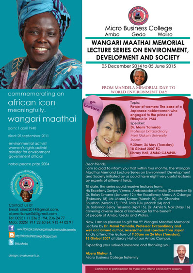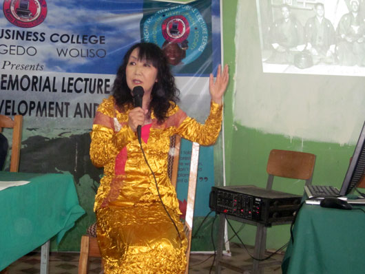今日はマイクロ・ビジネス・カレッジにて特別講義を開講した。英語での講義だが、タイトルを日本語に訳すと「女性の力―1934年にエチオピアの王子と婚約した日本人令嬢の場合」となる。