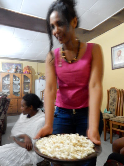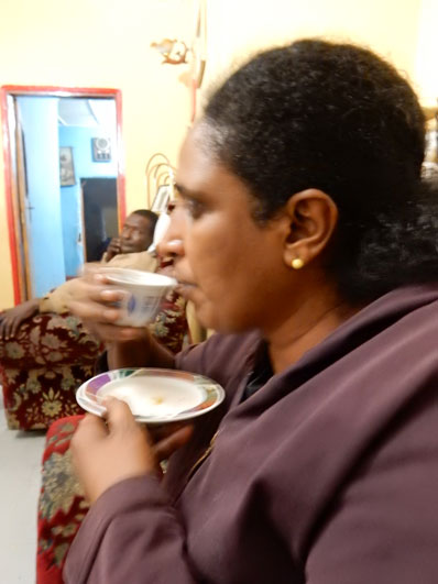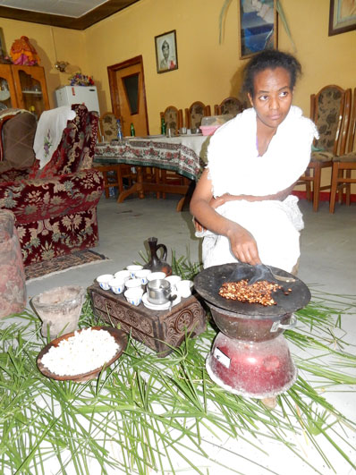 エチオピア第一日目。今回の第一回講義を行なうことになっているマイクロ・ビジネス・カレッジのアベラ学長の招待で、学長のお母さま宅(アジス・アベバ市内)にて歓迎のコーヒー・セレモニーの洗礼を受けた。