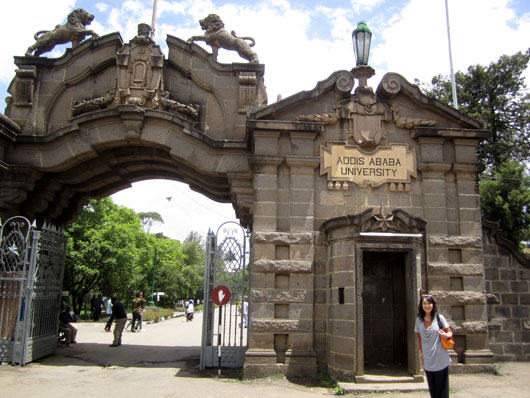 エチオピア最大の国立大学であるアジスアベバ大学の正門にて。